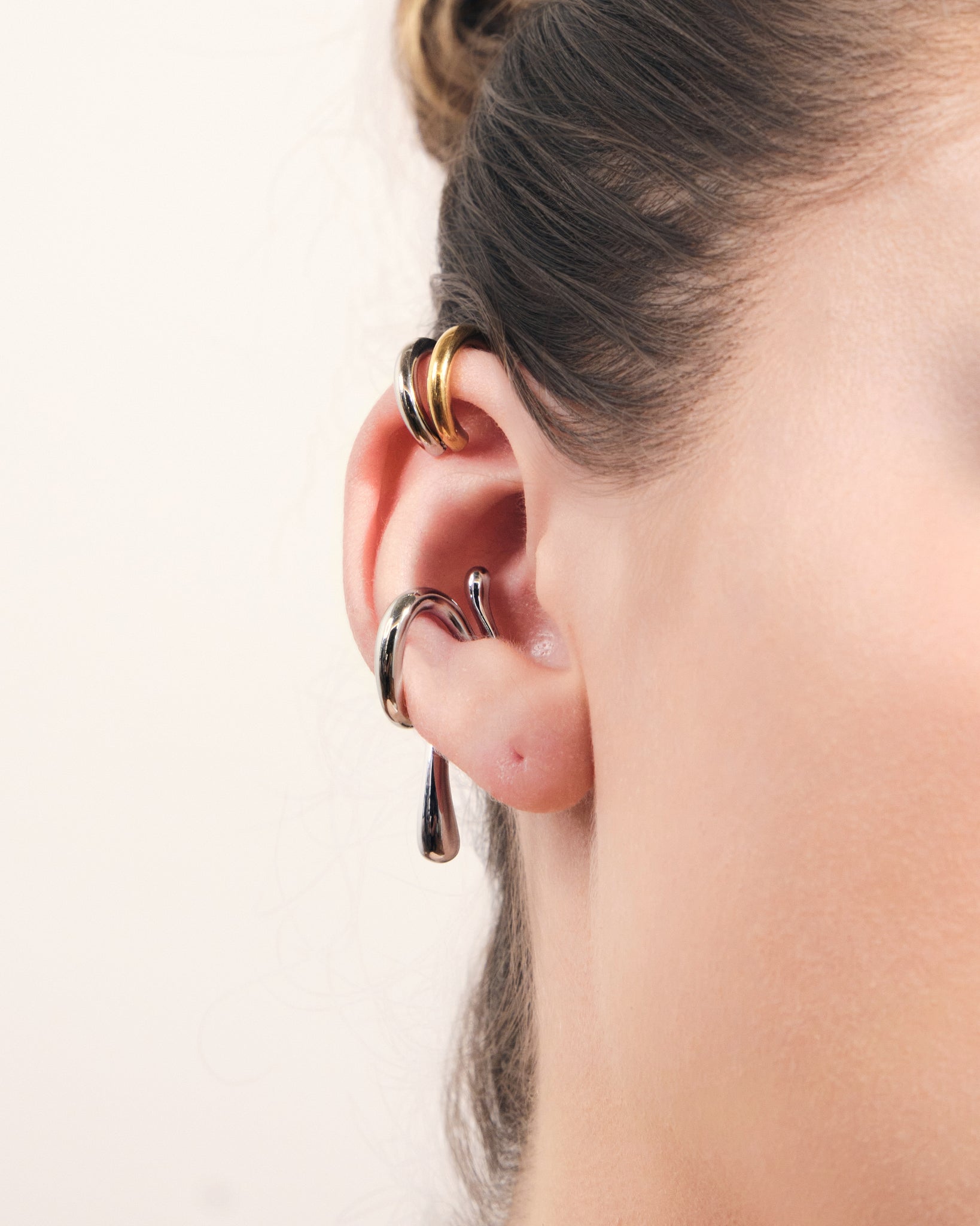 These modern ear cuffs feature smooth, wavy lines that wrap around the ear for a bold yet simple look. Designed with an open, abstract shape, they bring a touch of artful style to any outfit. Available in polished gold or silver, the fluid form adds shine and movement, making them easy to wear from day to night. Perfect for stacking with hoops or studs, or wearing solo as a statement piece.