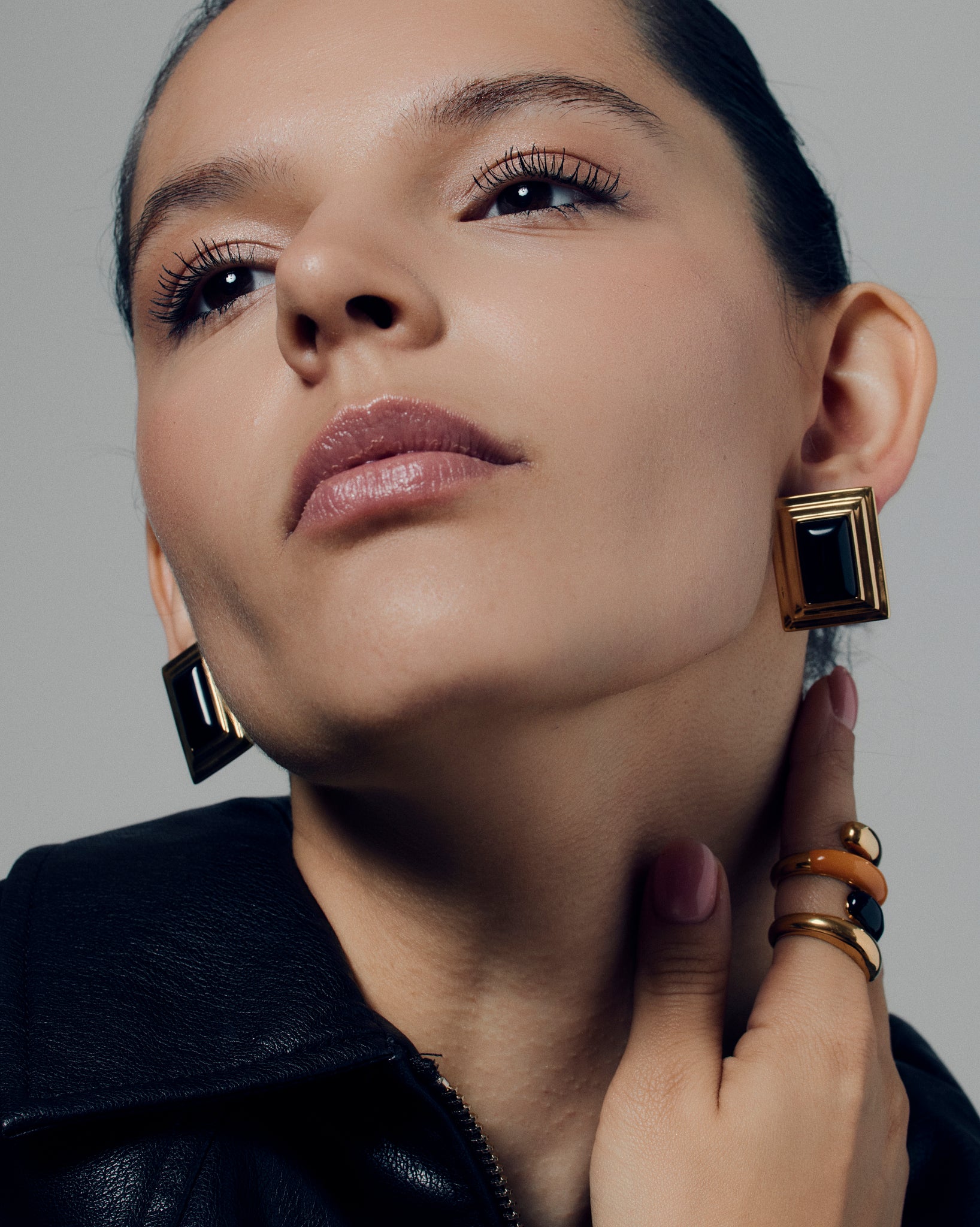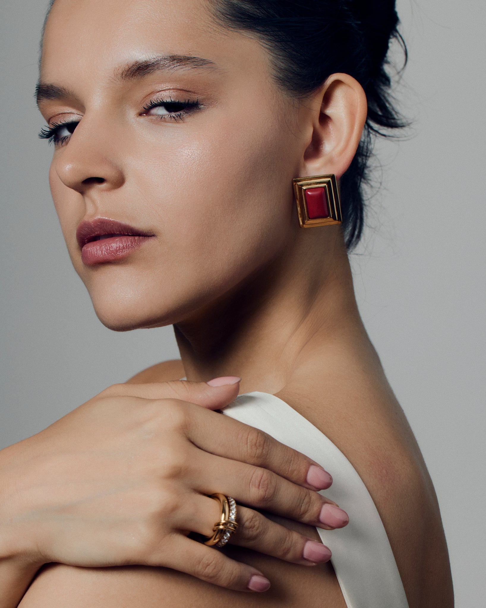 These rectangular statement earrings feature a deep red or black gemstone set in polished gold for a bold, geometric look. The raised frame adds subtle depth and texture, while the clean lines keep the design modern, minimal, and refined — perfect for day or evening wear.