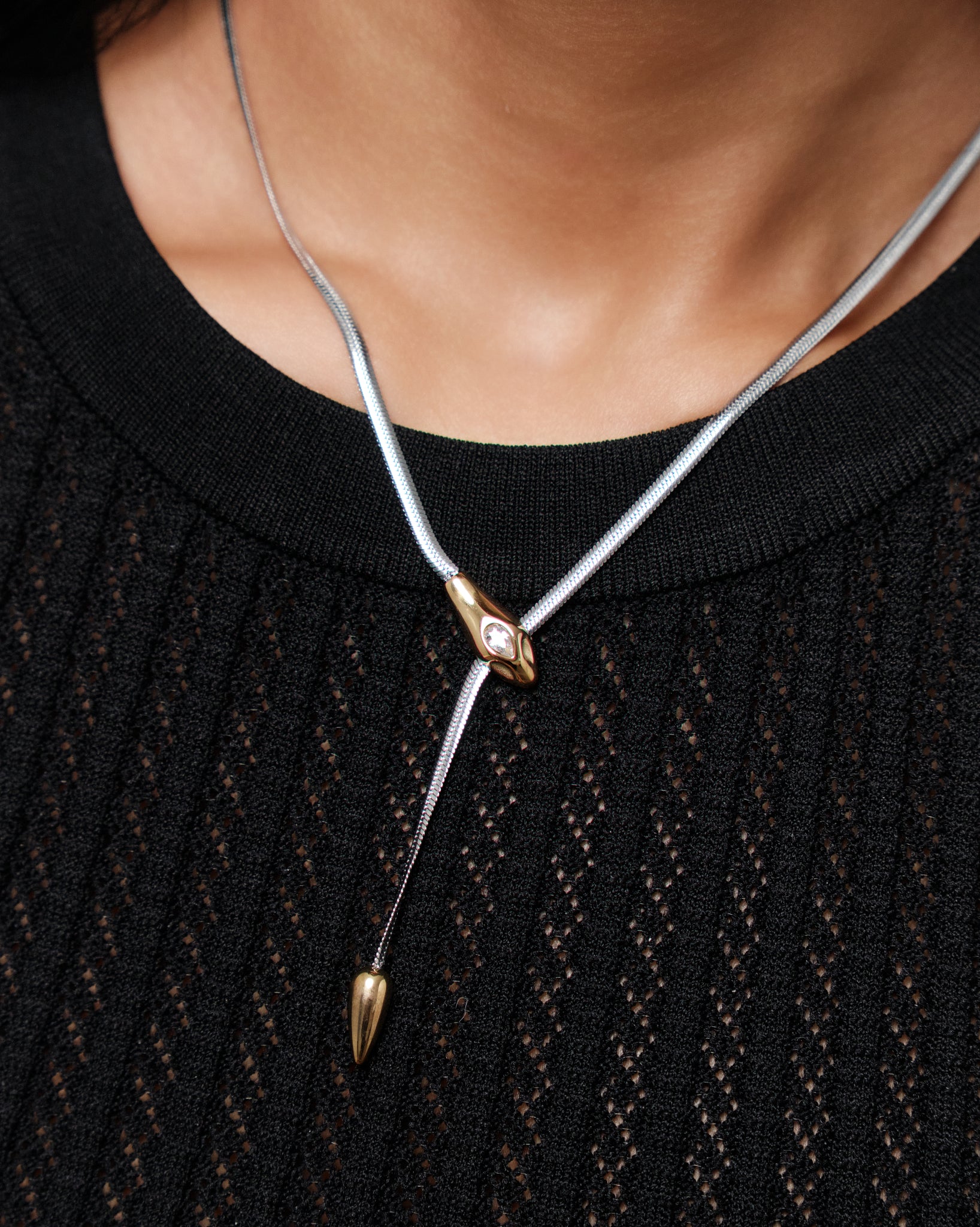 This serpentine lariat necklace features a serpentine pendant with a bezel-set crystal that adds a subtle shine. The adjustable drop design includes tapered teardrop ends for a modern, streamlined look. Its flexible chain and sliding center allow you to customize the length of the drop, making it easy to style for everyday wear or dressier occasions. A durable, tarnish-resistant finish ensures long-lasting shine and comfort for all-day use.