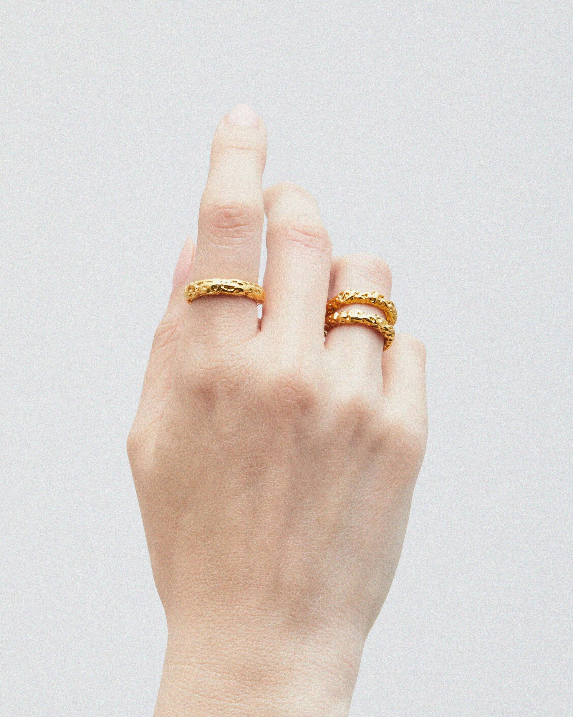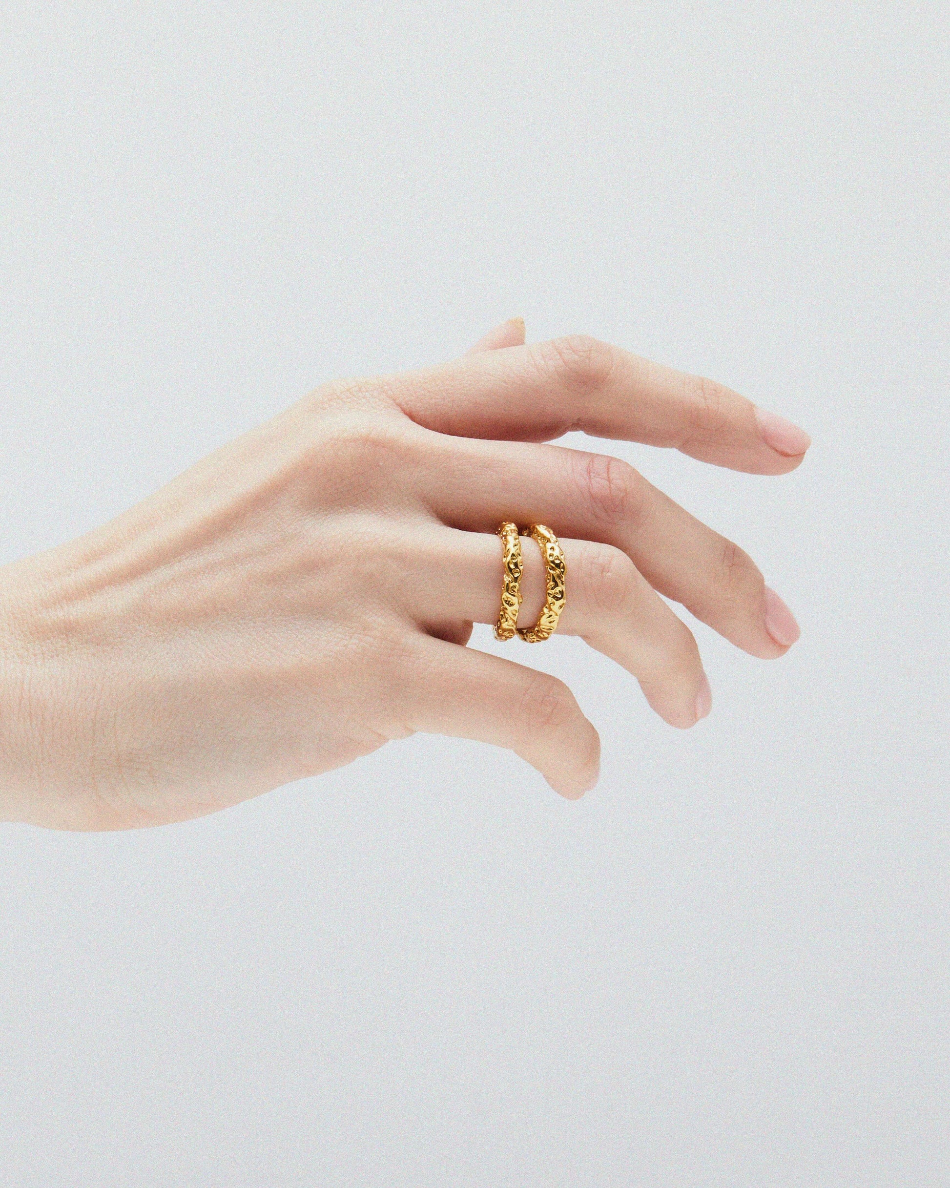The design features two layered bands, each boasting a unique textured finish that mimics the subtle patterns found in nature. Whether worn alone or stacked with other pieces, this ring adds a touch of refined style.